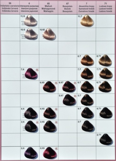 Odcienie zawierające pigment P5 (zwiększający intensywność koloru występuje w odcieniach miedzianych, mahoniowych, czerwieniach i fioletach na karcie kolorów zaznaczone gwiazdką)