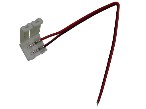 Złączka dwupunktowa typu klips do łączenia taśm LED o szerokości 8 mm, zakończoną przewodem dwużyłowym o długości ok. 14 cm.