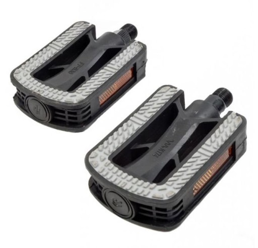 Pedały o korpusie wykonanym z tworzywa sztucznego z gumowymi wkładkami wyposażone w odblaski. Ośka wykonana z boronu z końcówką sześciostronną oraz kołnierzem dla ułatwienia montażu. Pedały posiadają łożyska kulkowe. Kolor czarno-szary