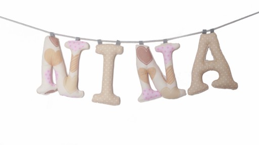 -do każdej literki wszyte są szare tasiemki bawełniane do zawieszenia ozdoby.