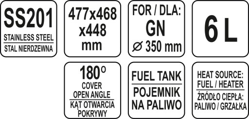 Podgrzewacz wyposażony jest w pojemnik do potraw o średnicy wewnętrznej 355mm a zewnętrznej 380mm, o głębokości 100mm i pojemności 6L. Ponadto posiada pojemnik na paliwo.