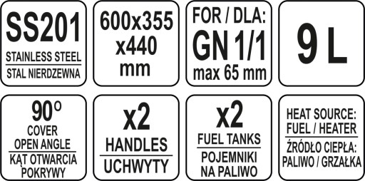 W zestawie posiada pojemnik GN 1/1 o wysokości 65mm wykonany ze stali nierdzewnej o pojemności 9L. Ponadto podgrzewacz ma 2 pojemniki na pastę. Przystosowany jest także do zamocowania grzałki pod spodem pojemnika.