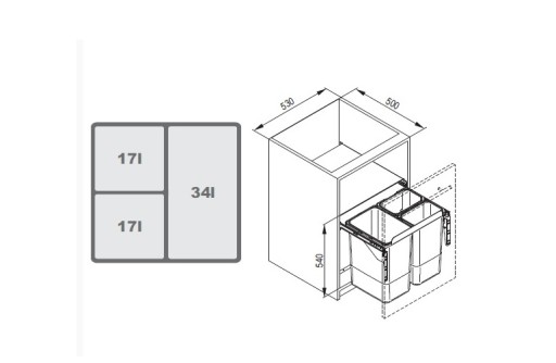 POJEMNIK NA ODPADY JC609M "60" Z MOCOWANIEM FRONTU WYSOKI (529X494X540) POTRÓJNY Z DOCIĄGIEM TWORZYWO SZTUCZNE