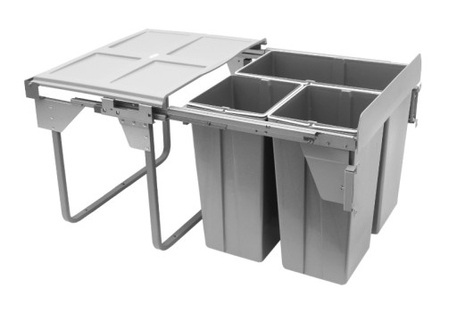 po pociągnięciu za front szafki.łatwy w montażu. Wysuwane pojemniki z centralnym przykryciem są umieszczone w mechanizmie z metalową prowadnicą pełnego wysuwu i cichym domykiem, dzięki której kosz przesuwa się lekko i precyzyjnie. Podczas otwierania przykrycie zostaje w środku szafki.