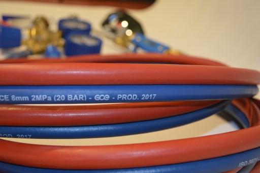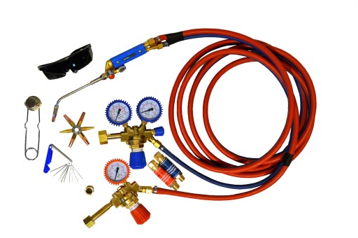 Zestaw palnika z dyszami, reduktorami oraz łączonym przewodem.
