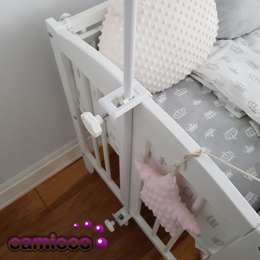 Dzięki temu, że posiada regulację, można go zamontować zarówno przy krótszym, jak i dłuższym boku łóżeczka za pomocą uchwytów