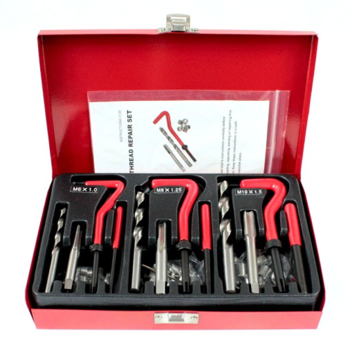- Zestaw przeznaczony jest naprawy uszkodzonych gwintów w silnikach i innych elementach pojazdów. Wiertła i gwintowniki wykonane zostały ze stali szybkotnącej HSS4341.