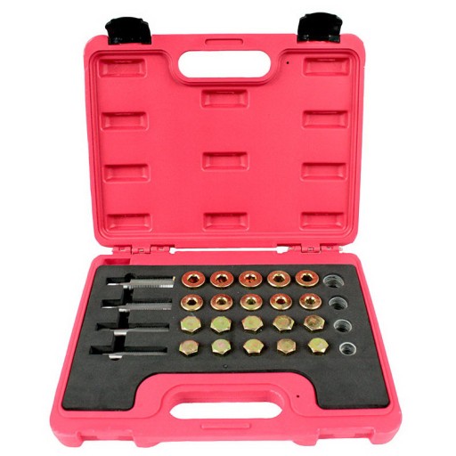 Zestaw do prostej naprawy gwintów korków spustowych miski olejowej, skrzyni biegów i innych.Pasuje do większości gwintów popularnie używanych w samochodach osobowych i lekkich samochodach ciężarowych. Zestaw przeznaczony do warsztatów samochodowych, naprawczych i serwisów. Całość zestawu umieszczona w mocnej, praktycznej walizce ułatwiającej transport i przechowywanie.