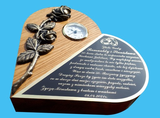 Piękny, oryginalny i niepowtarzalny prezent praktycznie na każdą okazję. Serce wykonane z litego drewna o wysokości 20 cm olejowane na kolor orzech (tył i boki), kolor naturalnego drewna (front) oraz pomalowane 3 - krotnie lakierem bezbarwnym o wysokim połysku. Grubość serca ok. 4 cm pozwala na samodzielne stanie na jednym z boków. Róża - odlew mosiężny patynowany, zabezpieczony specjalnym lakierem bezbarwnym. Tabliczka z mosiądzu grawerskiego z wygrawerowanym wierszem oraz dedykacją. Grawer koloru czarnego na złotym tle. Zegarek kwarcowy wciskany w otwór z możliwością wymiany baterii. Graweruję dowolne wiersze oraz dedykacje. Istnieje możliwość wykonania serca w kolorze białym.