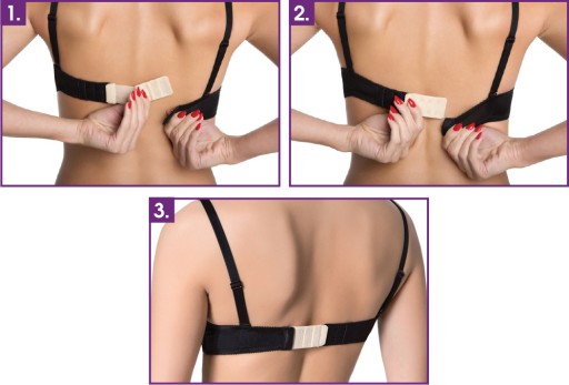 PRZEDŁUŻACZ obwodu biustonosza. Szybka i prosta metoda powiększenia obwodu biustonosza, który stał się zbyt ciasny. Dzięki uniwersalnemu rozstawowi haftek pasuje do wszystkich standardowych zapięć przy biustonoszu.