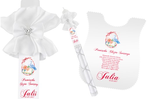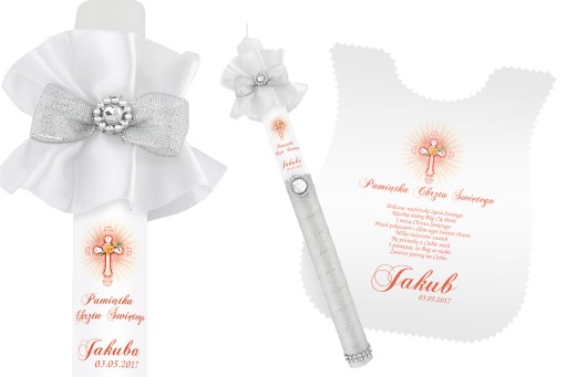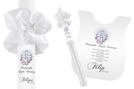 Eleganckie zestawy świec i szatek na chrzest. Prezentujemy dziesięć kompletów w różnych aranżacjach. Każda z nich jest dedykowana dziecku, które będzie przyjmowało Chrzest Święty. Znajdziesz stylizacje dedykowane chłopcu i dziewczynce. Ozdobne elementy wszystkich kompletów sprawiają, że szatka i świeca na chrzest będzie uroczą pamiątką Chrztu Świętego. Biała szatka na chrzest z imieniem dziecka stanie się prawdziwą niespodzianką. Do kompletu dołączona jest świeca z imieniem i datą Chrztu. Z pewnością nada całości niepowtarzalnego charakteru. Zadedykuj komplet do Chrztu podając imię oraz datę ceremonii oraz dedykację czy życzenia. Wyrazisty nadruk zachowa swój wygląd na wiele pokoleń. Dopasowane grafiki subtelnie poróżniają każdy zestaw, możesz bez problemu wybrać jeden z nich. Świece to kunszt ręcznie robionego dzieła, który zachwyci każdą osobę.