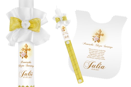 Jest to świeca na chrzest dziecka. Osobliwe złote zdobienia przełamane bielą nadają całej aranżacji uroczystego charakteru. Delikatne dodatki w postaci różyczek czy kokardki sprawiają, że świeca z nadrukiem imienia jest elegancja. Satynowa szatka na chrzest okalana filigranowymi wzorkami wzbudza szczególny zachwyt.