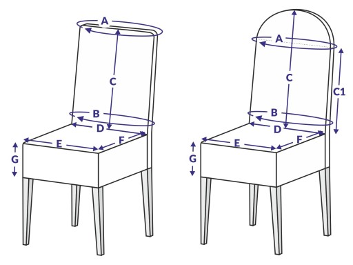 Należy podać rzeczywiste wymiary krzesła, my dodajemy odpowiedni luz aby pokrowce pasowały. Zazwyczaj dodajemy po 1-1,5 cm w zależności od wymiaru, z wyjątkiem wymiaru G, gdzie należy podać docelową długość pokrowca.