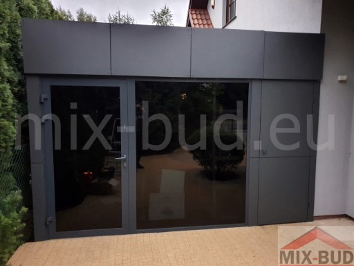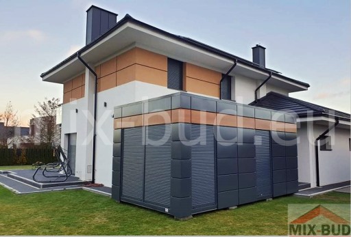 Wyposażenie: 1x drzwi Hörmann EI30,1x okno 1200 mm x 1200 mm, podłoga 100 mm + wykładzina PCV, ściana 100 mm styropian, dach 120 mm styropian,rynna PCV, obróbki blacharskie, rama stalowa standard)