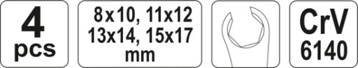 Zestaw zawiera klucze w rozmiarach: 8x10, 11,x12, 13,x14, 15x17