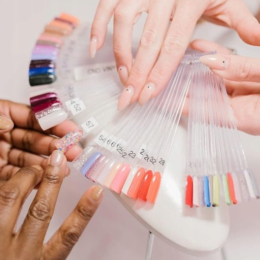 Wzornik w formie wachlarza umożliwia wygodne porównywanie różnych odcieni lakierów na jednym miejscu. Można łatwo zobaczyć, jak poszczególne kolory wyglądają obok siebie, co ułatwia wybór odpowiedniego koloru do manicure lub pedicure.
