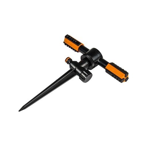 2-ramienny zraszacz obrotowy "DUO". Wykonany z tworzywa sztucznego na kolcu. Każde ramię jest regulowane w 3 pozycjach. Możliwość szeregowego połączenia z innymi zraszaczami. Obszar zraszania 13m.