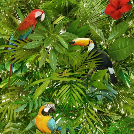 ОБОИ УЗОР ЗЕЛЕНЫЕ ЛИСТЬЯ ДЖУНЛИ РАЗНОЦВЕТНЫЕ ПОПУГАИ