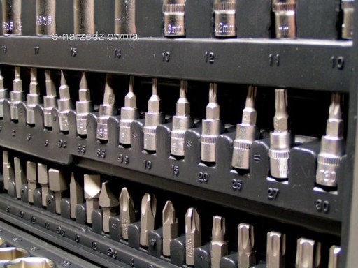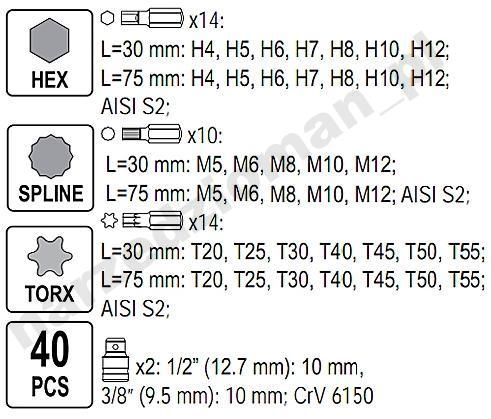 Zestaw bitów, służący do odkręcania śrub specjalnych typu: hex, torx, spline. Różnorodność bitów zapewnia możliwość wykonania wielu prac w specjalistycznych serwisach mechanicznych i samochodowych. Końcówki posiadają dwie długości 30 oraz 75 mm, mocowane w uchwycie sześciokątnym 10 mm, dostosowanym do współpracy z grzechotką 1/2" oraz 3/8".