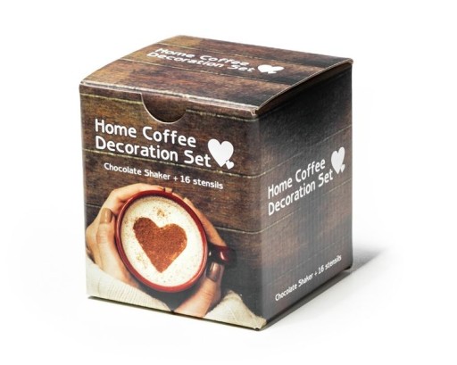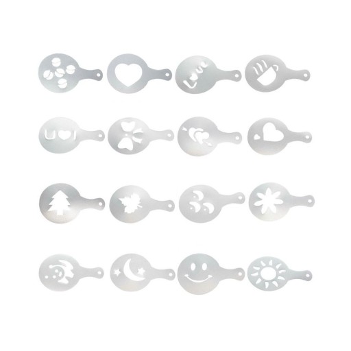 - zestaw do dekoracji kawy, ciast i deserów: shaker + 16 szablonów