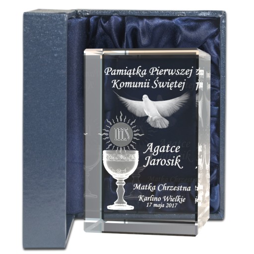 Wygrawerowany trójwymiarowy kielich liturgiczny z gołąbkiem 3D oraz własną dedykacją w kryształowej kostce stanowi niezwykle efektowny PREZENT na pamiątkę tak uroczystej okazji jaką jest Pierwsza Komunia Święta.