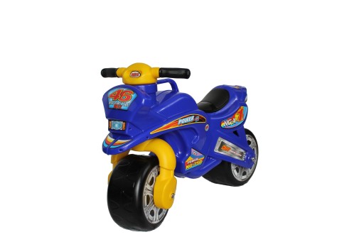Stylizowane naklejki dodają zabawce sportowego charakteru. Mały kierowca wsiadając na swój motor będzie się czuł jak prawdziwy motocyklista. Duże i solidnie wykonane koła powodują, że motorek jest bardzo stabilny - postawiony nie przewraca się. Bez problemu dziecko będzie poruszać się w domu i na podwórku. Szerokie opony pozwolą na jazdę po chodniku, trawniku, a nawet po piasku. Wygodne siedzisko zapewni swobodę poruszania się i bezproblemowe wsiadanie i zsiadanie z motoru. Widelec przedni skrętny.