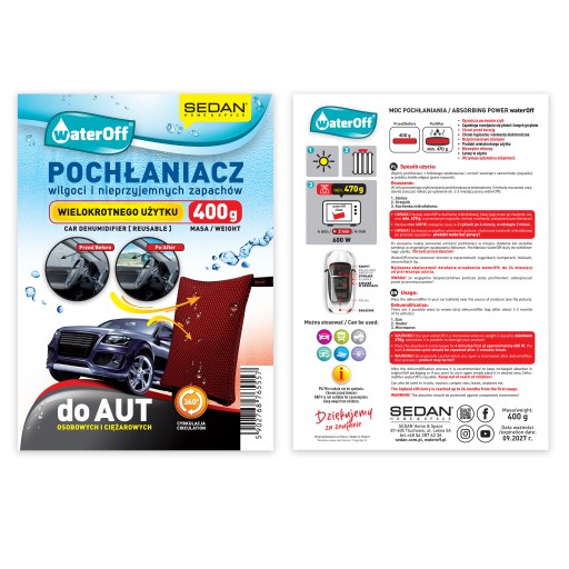 Idealne rozwiązanie na zwiększony poziom wilgoci we wnętrzu auta w okresie jesienno-zimowym. Wilgoć w aucie powoduje przyspieszenie procesów korozji. Wpływa ona negatywnie nie tylko na materiały wykończeniowe, tapicerkę i dywaniki, ale jest podstawową przyczyną rozwoju pleśni i zagrzybienia. Oznaką tego jest wszechogarniający zapach stęchlizny, bardzo trudy do usunięcia. Zaparowane szyby znacznie ograniczają widoczność, co powoduje pogorszenie bezpieczeństwa jazdy, a nawet mogą być przyczyną wypadku. Wilgoć w aucie to poważny problem. Aby się z nim uporać należy ograniczyć dopływ wilgoci z zewnątrz, a następnie zastosować nowoczesny preparat WaterOff, który pochłonie jej nadmiar. Szybki i wygodny w użyciu, o estetycznym wyglądzie, doskonale sprawdza się w aucie osobowym, ciężarówce, ciągniku, łodzi czy awionetce.