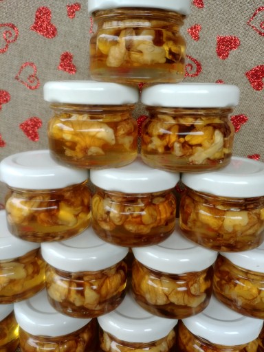 - słoiczki z orzechami włoskimi wypełnione naturalnym miodem wielokwiatowym.