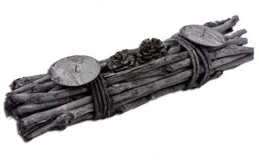 Świecznik świąteczny szary z powiązanych gałązek, z dwoma podstawkami na świeczki i szyszkami