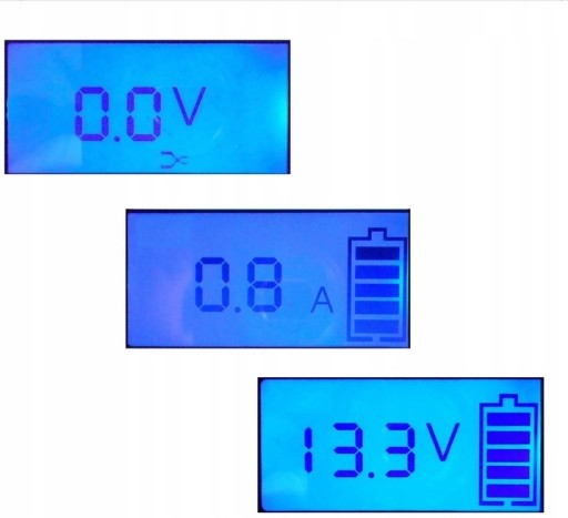 wyświetlacz LCD / ładowanie impulsowe / wyłącznik czasowy po całkowitym naładowaniu / ładowanie bez zasiarczania / ładowanie podtrzymujące / zabezpieczenie przed zwarciem