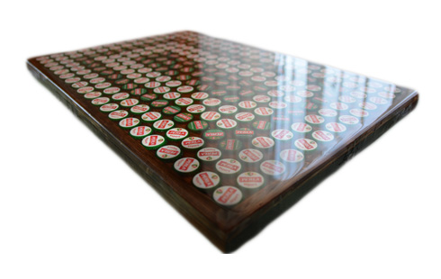 Przykład wykonania stolika z zatopionymi elementami w tym przypadku kapslami od piwa.