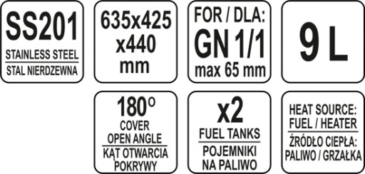 W zestawie posiada pojemnik GN 1/1 o wysokości 65mm wykonany ze stali nierdzewnej o pojemności 9L. Ponadto podgrzewacz ma 2 pojemniki na pastę. Przystosowany jest także do zamocowania grzałki pod spodem pojemnika.