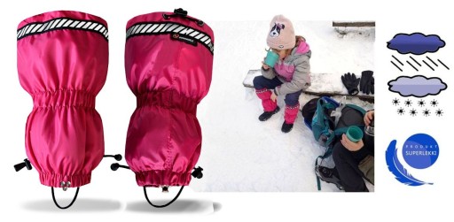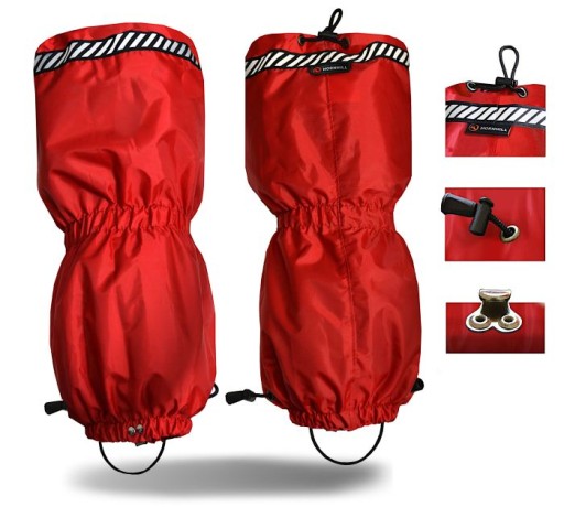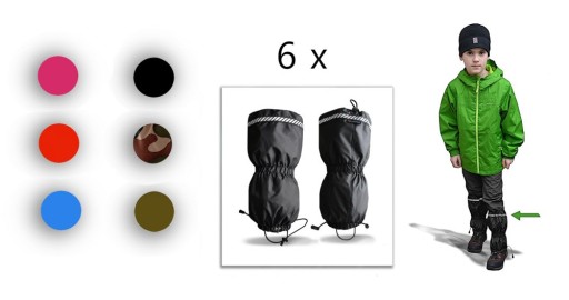 - Góra ochraniacza posiada sznurek z klipsem regulującym jego długość, dzięki czemu można szczelnie docisnąć materiał na nodze.