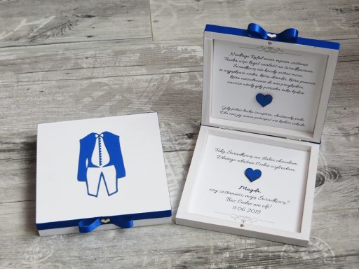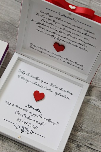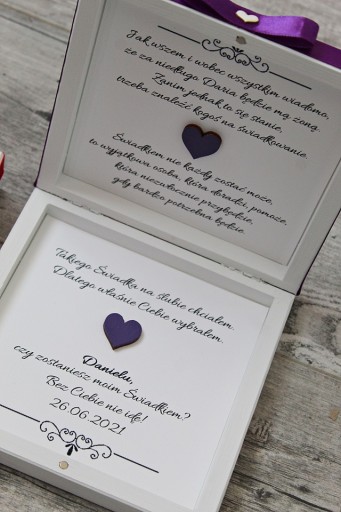 Wykonywane na zamówienie zaproszenie dla świadka/świadkowej. Jest to drewniane pudełko pomalowane na biało, wykańczane ręcznie. Ozdobione dekorem (do wyboru) oraz zdobieniami (wstążka i serduszka w środku).