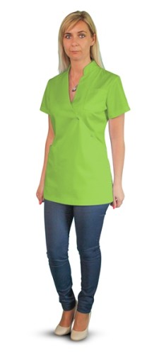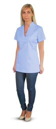 Góra fartucha elegancko wykończona jest stójką. Krótki rękaw sprawia, że fartuch nie ogranicza ruchów i jest bardzo wygodny.
