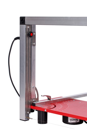 - Blat roboczy tej maszyny do cięcia styropianu wykonany jest z wodoodpornej sklejki pokrytej trzema warstwami emalii. Skala na blacie roboczym oraz podziałka prowadnicy ramy ruchomej wykonana jest w technice sitodruku natomiast pozostałe skale, podziałki i napisy ostrzegawcze są w formie zalaminowanych, odpornych na ścieranie nalepek.