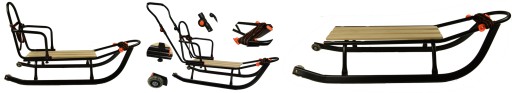 REGULOWANA BUDKA BŁYSKAWICZNY MONTAŻ I ŁATWOŚĆ DEMONTAŻU OPARCIA I PCHACZA 5 STOPNIOWA REGULACJA WYSOKOŚCI PCHACZA ELEMENT ODBLASKOWY W BUDCE WYMIARY SANEK