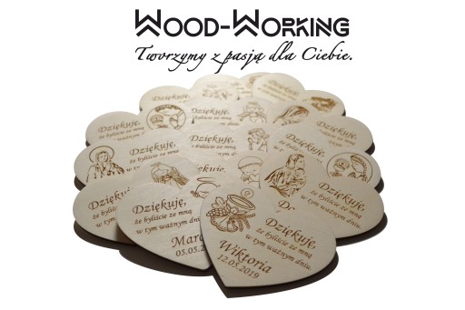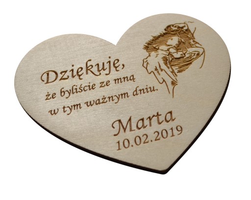 Podziękowanie dla gości w formie drewnianego magnesu.