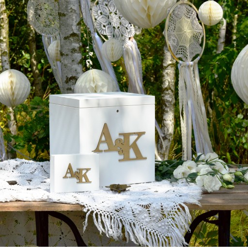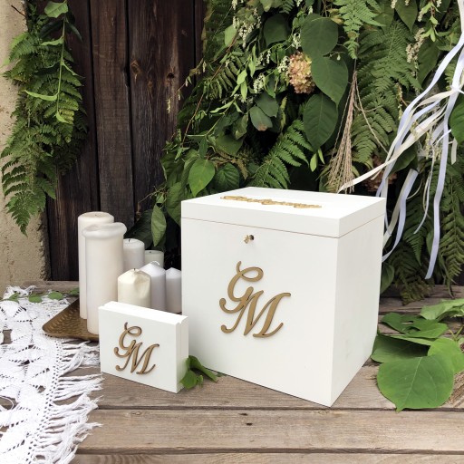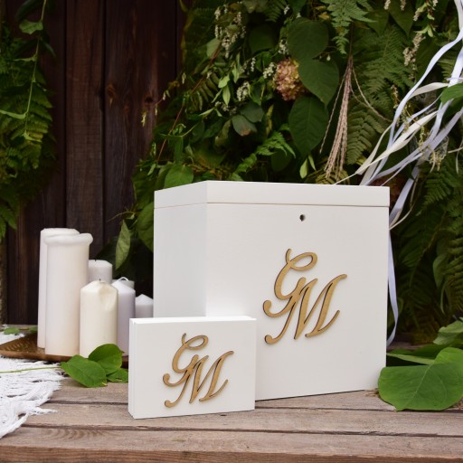 Oba przedmioty zachowany w eleganckim stylu. Na pudełkach możesz umieścić swoje złote inicjały.