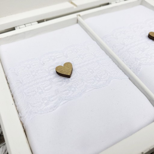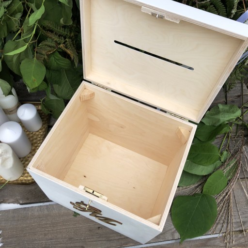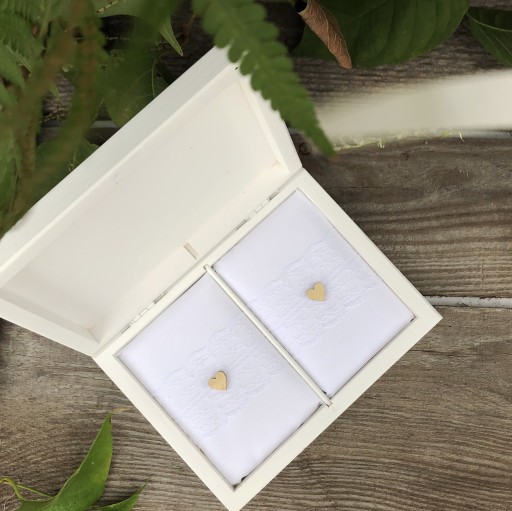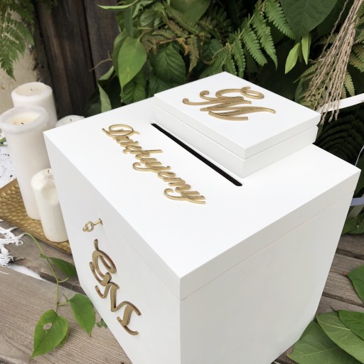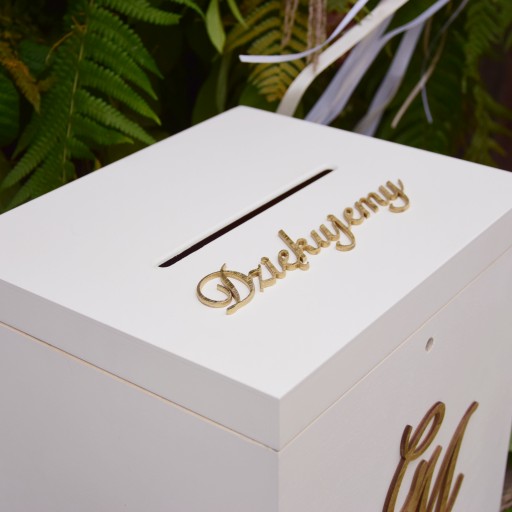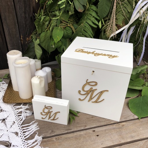Na naszej aukcji oferujemy piękne białe pudełko na obrączki oraz pudełko na koperty.