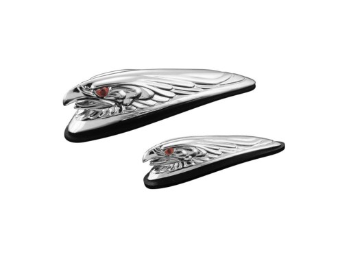 Stylowa ozdoba na błotnik do choppera, customa lub innego motocykla. Orzełek w kolorze srebrnym, metalowy, chromowany. Z pewnością nada Twojemu motocyklowi nowy charakter, bardzo fajnym dodatkiem tego ornamentu jest to, że posiada świecące oczy, które są podłączone pod motocyklową elektrykę.