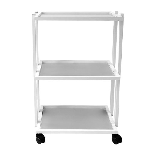 Bestseller wśród oferowanych stolików kosmetycznych. Stolik z trzema szklanymi półkami łatwymi do utrzymania w czystości i odpornymi na preparaty do dezynfekcji. Stolik posiada metalowy stelaż lakierowany na biało, szklane półki z matowego szkła oraz komplet obrotowych kółek. Dzięki temu rozwiązaniu wózek jest "cichy" i łatwy do przesuwania. Stolik doskonale nadaje się pod urządzenia kosmetyczne.