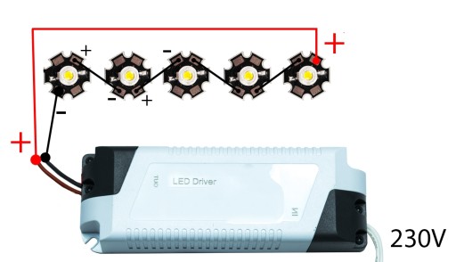 Nie są potrzebne oporniki ani dodatkowe zasilacze. Stronę z dwoma białymi przewodami podłączamy do siei 230V. Czerwony przewód należy podłączyć do "+" diody na początku szeregu a czarny do "–" półprzewodnika na drugim końcu układu.