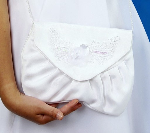 Torebka komunijna wykonana z białego matowego materiału. Torebka do powieszenia na