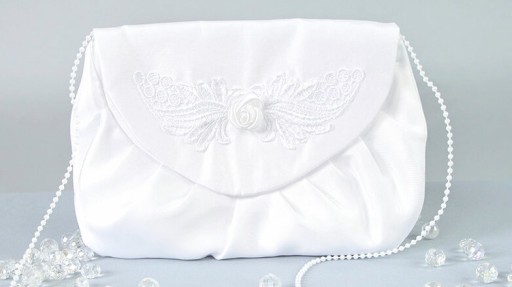 Zdobiona gipiurą i atłasową różyczką. Rozmiary torebki 16x22 cm.