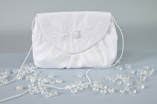 Torebka komunijna wykonana z białego, matowego materiału.