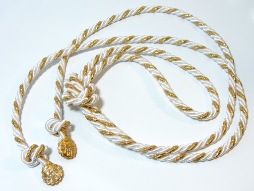 Biało - złoty sznur do alby, ze złotymi zakończeniami IHS. Średnica 7 mm.