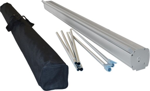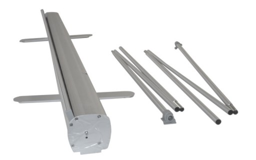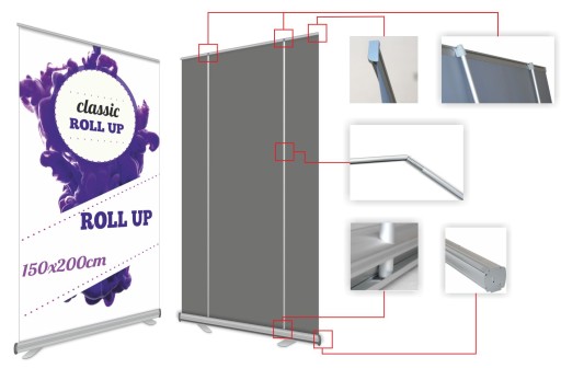 Roll-up składa się z aluminiowej kasety i stelaża z zamocowaną grafiką. Jest to lekka i prosta konstrukcja, umożliwiająca łatwe i szybkie składanie i rozkładanie (grafika jest rozwijana i chowana w kasecie).