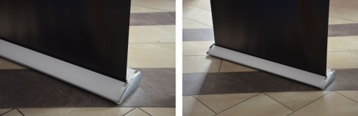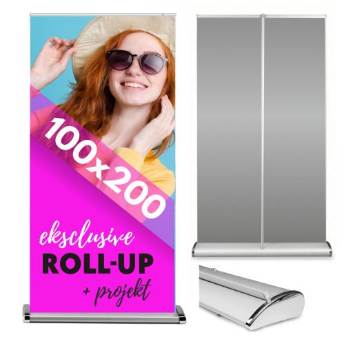 Roll-up składa się z aluminiowej kasety i stelaża z zamocowaną grafiką. Wersja Exclusive posiada ciężka i elegancką kasetę bez nóżek, grubą tyczkę, oraz chromowane boki.