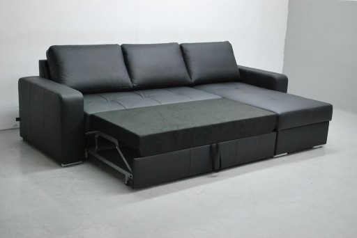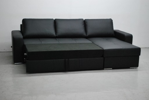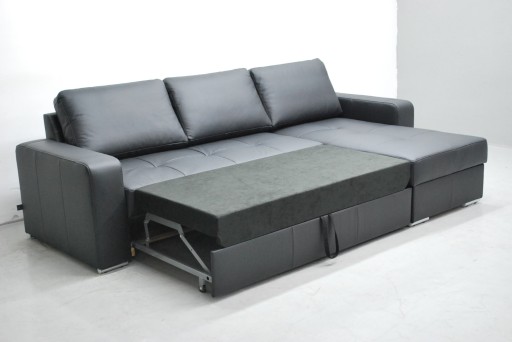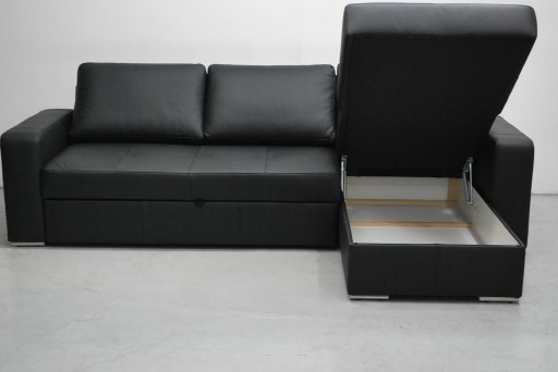 Narożnik jest z fabrycznie nowy wykonany z naturalnej skóry, z funkcją spania i pojemnikiem na pościel w kolorze czarnym. Narożnik może być prawo lub lewostronny.